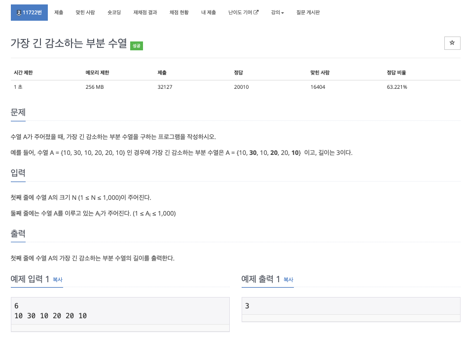 백준11722 - 가장 긴 감소하는 부분 수열(DP) node.js 본문
