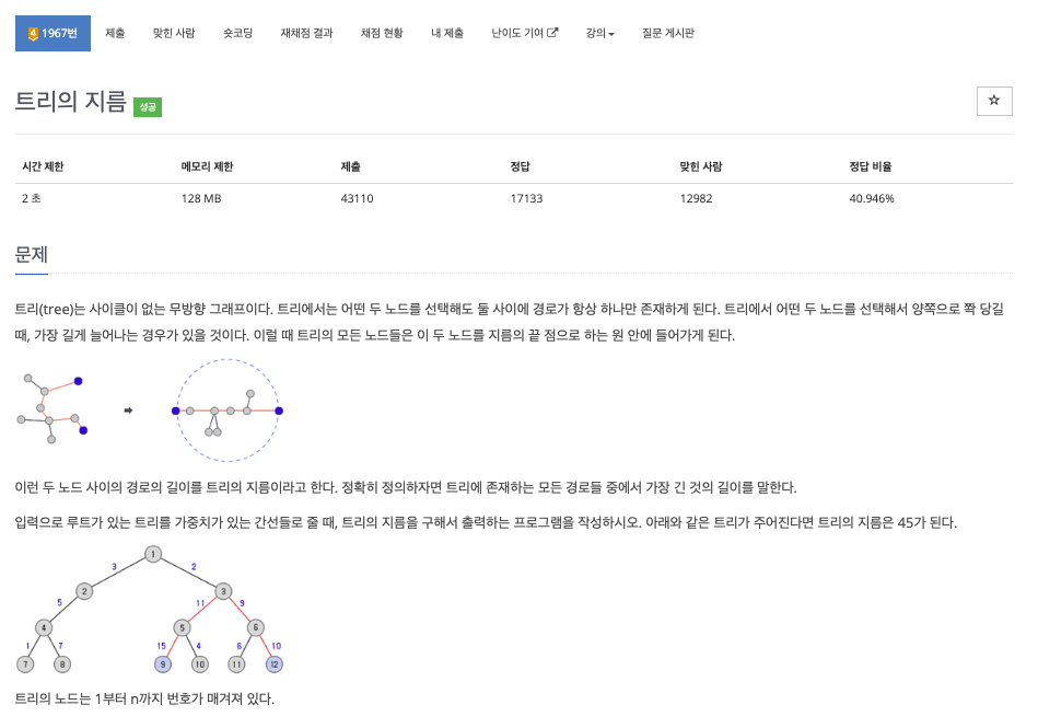 해당 문제는 트리의 지름을 구하는 문제로, 노드와 노드 사이의 가장 긴 거리를 출력하는 문제다.